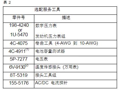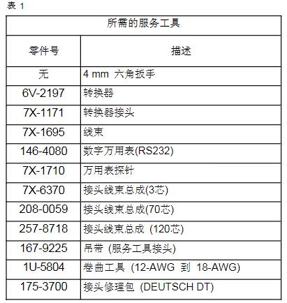 卡特電氣服務(wù)工具被設(shè)計(jì)用來(lái)幫助服務(wù)工程師完成以下任務(wù):• 獲得信息• 分析系統(tǒng)• 系統(tǒng)校準(zhǔn)• 系統(tǒng)設(shè)置• 數(shù)據(jù)鏈路通訊所需的服務(wù)工具表1列出的工具是服務(wù)工程師完成本手冊(cè)上的測(cè)試程序所需要的。