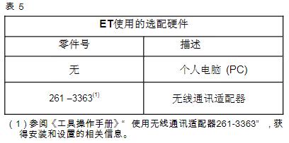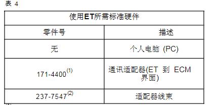 注意:更多卡特ET的使用信息和對(duì)應(yīng)計(jì)算機(jī)配置需求,請(qǐng)參閱卡特ET軟件的相關(guān)文檔。連接ET用通訊適配器II連接表4列出連接卡特ET所需要的標(biāo)準(zhǔn)硬件。