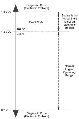 典型模擬溫度傳感器的輸出電壓圖8表示了一個(gè)典型模擬傳感器的信號(hào)范圍。如果傳感器輸出信號(hào)低于0.2 VDC或高于4.8 VDC,就會(huì)生成診斷代碼。 動(dòng)態(tài)診斷代碼激活的診斷代碼代表了電氣控制系統(tǒng)的問(wèn)題。盡可能快地糾正問(wèn)題。當(dāng)生成一個(gè)動(dòng)態(tài)診斷代碼時(shí),“ 動(dòng)態(tài)警告” 指示燈(在卡特ET“ 發(fā)動(dòng)機(jī)控制警告狀態(tài)” 上)被激活,以警告操作者。如果生成卡特cat代碼的情況是暫時(shí)的,信息會(huì)從動(dòng)態(tài)診斷代碼清單中消失。診斷代碼變?yōu)槿罩尽?br />