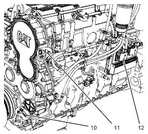 圖70g0H94i00CAT攤鋪機發動機左側視圖(范例)(10)主速度/時間感應塞(11)次速度/時間傳感器(12)P2ECM接頭B.徹底檢查接頭(10),(11)和(12)。參考《故障排除》“電氣接頭-檢查”獲得細節。