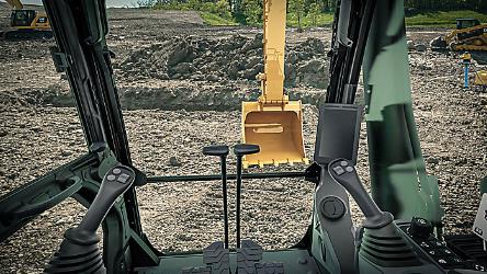 通過采用更小的駕駛室立柱、寬大的車窗和平坦的發動機罩設計,無論是溝渠內側、每個回轉方向還是操作員后部,操作員均可獲得卓越的視野。