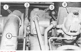 (1)渦輪增壓器進氣口(2)燃料吸入管路(3)水冷式渦輪機殼體(4)排氣旁通閥(5)放油管