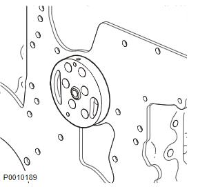 12 安裝不帶減振器的曲軸齒輪。對準標記與沃爾沃發動機正時盤中的孔。在螺栓下面房子適當的隔片,用作減振器替換件。