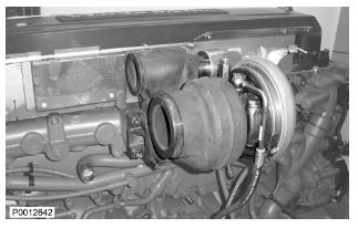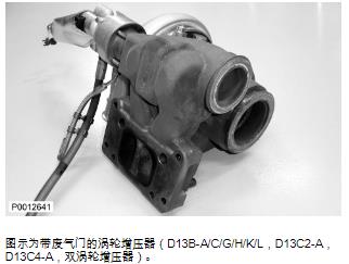 62 僅適用于 D13B-A/C/G/H/K/L,D13C2-A,D13C4-A(雙渦輪增壓器)檢查廢氣門閥上的密封表面。檢查將廢氣門殼體固定到渦輪增壓器上的緊固件是否緊固。僅適用于 D13B-B/D/E/F/J/M/N,D13C1-A,D13C3-A(單渦輪增壓器)檢查渦輪增壓器上的密封表面。