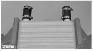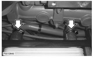 67 僅適用于 D13B-A/C/G/H/K/L,D13C2-A,D13C4-A(雙渦輪增壓器)如圖示將軟管夾緊固到位(以在裝配發動機時緊固/松開它們)。檢查冷卻劑管和軟管,確保其不與增壓空氣冷卻器后面的任何部分發生摩擦。