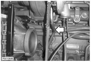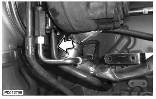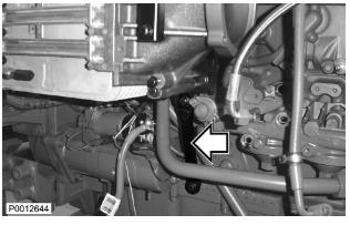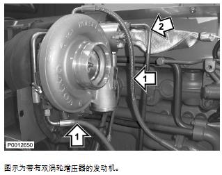 74 僅適用于 D13B-A/C/G/H/K/L,D13C2-A,D13C4-A(雙渦輪增壓器)安裝渦輪增壓器和廢氣門閥輸油軟管。用一個電纜結將廢氣門閥輸油軟管固定到渦輪增壓器回油管上。