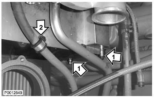 79 僅適用于 D13B-A/C/G/H/K/L,D13C2-A,D13C4-A(雙渦輪增壓器)緊固下部渦輪增壓器隔熱罩上的兩個螺栓(1)。將水軟管(2)夾緊至回油管上。