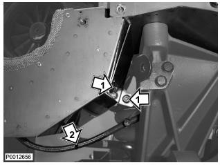 72 僅適用于 D13B-A/C/G/H/K/L,D13C2-A,D13C4-A(雙渦輪增壓器)安裝將隔熱罩固定到歧管上的兩個螺栓和墊片(1)。不要完全緊固螺栓。安裝將隔熱罩側面固定到其下部的螺栓。用中心螺栓夾緊輸油軟管(2)。不要完全緊固螺栓。