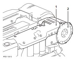 8 拆下回油管(1)和電纜結(jié)。拆下用于冷卻水的下部冷卻劑軟管(2)。