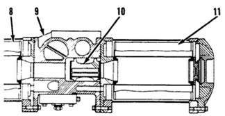 當(dāng)手柄(4)被拉到“輔運(yùn)轉(zhuǎn)”位置時(shí),潤(rùn)滑油會(huì)被輔助濾芯清理掉。過濾后的油會(huì)經(jīng)檢驗(yàn)閥(10)向右流并阻塞主倉(cāng)內(nèi)的油路。在這個(gè)位置,當(dāng)油壓消失后,主過濾管將被更換,主倉(cāng)會(huì)被抽空。