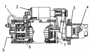 電磁閥(2)在空心氣缸周圍有繞組(一組或兩組)。彈簧加載的柱塞位于氣缸內(nèi)。柱塞可以前后移動。當(dāng)啟動開關(guān)閉合,電流通過繞組輸送時,產(chǎn)生磁場(1)。磁場(1)將柱塞在氣缸中向前拉。這會移動換檔桿,使小齒輪驅(qū)動齒輪與齒圈接合。然后,柱塞前端通過電磁閥(2)的蓄電池和馬達(dá)端子進(jìn)行接觸。接下來,起動馬達(dá)開始轉(zhuǎn)動發(fā)動機(jī)的飛輪。當(dāng)起動開關(guān)打開時,電流不再流過繞組。彈簧現(xiàn)在將柱塞推回到原始位置。同時,彈簧使小齒輪遠(yuǎn)離飛輪。