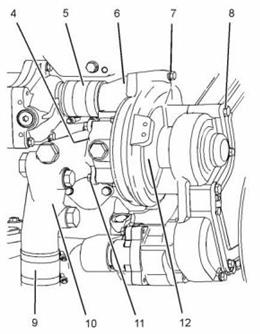 7. 將新的O形密封圈(4)(未顯示)安裝到水泵(12)上。將接頭(10)放置在水泵上,然后安裝螺栓(11)。將螺栓擰緊至28 N•m(21 lb ft)的扭矩。