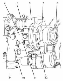 3. 將卡特C13珀金斯2206柴油機水泵(12)定位到發(fā)動機上并安裝螺栓(8)。將螺栓擰緊至55 N•m(41 lb ft)的扭矩。