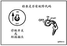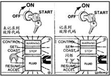 將車輛鑰匙開關扳至“ON”位置。如果沒有記錄現行故障代碼,兩個指示燈將亮起并保持這一狀態。如果記錄有現行故障代碼,兩個指示燈將瞬時亮起,然后開始閃爍記錄的故障代碼。