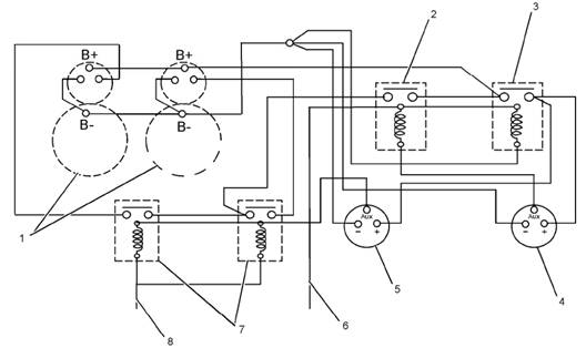 1)啟動馬達 2)繼電器1 3) 繼電器2 4)燃油電磁閥繼電器1 5) 燃油電磁閥繼電器2 6) 燃油電磁閥 7)起動繼電器 8)起動信號