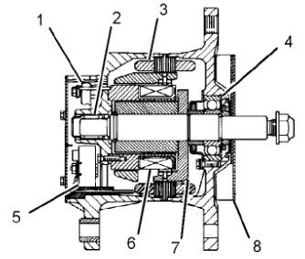 (1)調壓器 (2)轉子軸承 (3)定子繞組 (4)滾珠軸承 (5)整流橋 (6)勵磁繞組 (7)轉子組件 (8)風扇