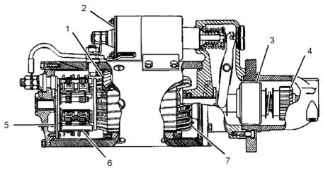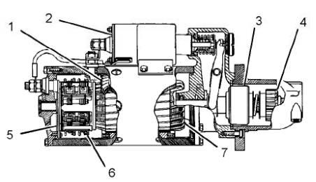 (1)磁場 (2)電磁閥 (3)離合器 (4)小齒輪 (5)整流器 (6)電刷組件 (7)電樞