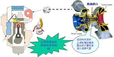由于廢氣渦輪增壓器是依靠進(jìn)排氣的平衡壓力密封潤(rùn)滑油的,因此,在啟動(dòng)和關(guān)閉機(jī)器時(shí),總是要有少量的發(fā)動(dòng)機(jī)機(jī)油漏出,這也是所有采用廢氣渦輪增壓器所具有的特點(diǎn).
