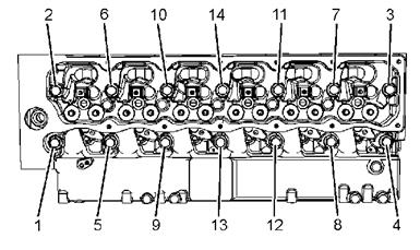 用干用干凈的發(fā)動(dòng)機(jī)機(jī)油潤(rùn)滑螺紋和螺栓頭的下部。 按圖 14 中所示的順序?qū)⒙菟ㄉ暇o到以下扭矩。50 N•m (37 lb ft)再次將螺栓擰緊至以下扭矩。160 N•m(118 lb ft)將螺栓頭擰緊到附加量。130 度