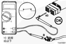 測量電阻。萬用表 必須顯示為閉路(10 歐姆或更小)。如果測量結(jié)果大于 10 歐姆,回路電源導(dǎo)線中存在開路。維修導(dǎo)線,或更換線束。參考 OEM 故障診斷及排除手冊。