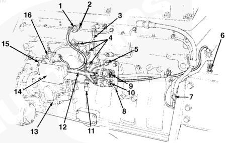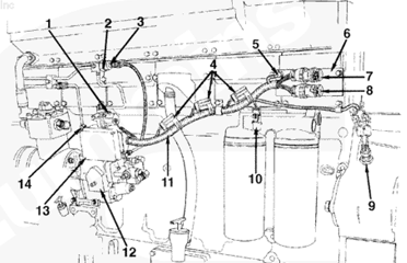1油軌壓力傳感器,2燃油連接塊,3燃料切斷閥4發(fā)動機(jī)線束,5 C6 接頭,6 C5 接頭,7 OEM C5 和 C6 接頭支架,8發(fā)動機(jī)轉(zhuǎn)速傳感器,9系統(tǒng)接地接頭,10液壓機(jī)械式 STC 執(zhí)行器,11發(fā)動機(jī)側(cè)數(shù)據(jù)通信接頭,12保險絲 (5A),13 ECM,14燃油泵,15電子燃油控制閥。