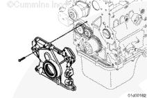 將康明斯前齒輪室蓋安裝到缸體安裝螺釘上,將油底殼安裝到前齒輪室蓋安裝螺釘上。這時不要擰緊螺釘。