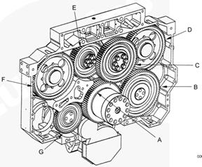 曲軸齒輪采用兩件/分離式設(shè)計。兩件式齒輪的后部用于水、機(jī)油和液壓驅(qū)動裝置。兩件式齒輪的前部增加了齒牙數(shù),以提高氣門機(jī)構(gòu)的負(fù)載能力。