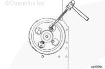 如有必要,轉動凸輪軸以便凸輪軸上的孔能夠接近止推板上的螺紋孔。安裝兩個螺栓和鎖定板。扭矩值: 45 n.m [33 ft-lb]