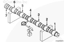 K38 和 K50 發動機的凸輪軸有所不同,然而安裝步驟相同。確保安裝了正確的凸輪軸。參閱控制零件目錄 (CPL) 了解正在修理的發動機。有些較新的 K50 發動機安裝了使發動機具有不同點火次序的凸輪軸。記錄壓印在凸輪軸端部的零件號,以備將來參考。使用 Lubriplate™ 徹底潤滑每個凸輪軸和所有凸輪軸襯套。