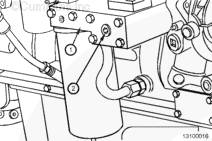 將直螺紋適配器 (1) 裝入機油濾清器座 (6) 中,其中螺塞已拆下。將 90 度彎頭 (2) 裝入適配器。將單向閥 (3) 裝入彎頭。單向閥上的箭頭必須指向彎頭,并且與油流方向一致。將陽性軟管適配器 (4) 裝入單向閥。將預潤滑軟管 (5) 連接到陽性軟管適配器。