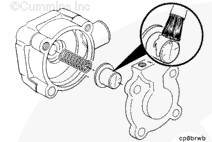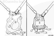 康明斯水泵漏水孔 (1) 處有少量化學(xué)堆積物或出現(xiàn)條紋屬正常現(xiàn)象。不要維修或更換水泵,除非確認(rèn)確實(shí)泄漏。有關(guān)更換問題,請(qǐng)與Cummins® 特約維修站聯(lián)系。