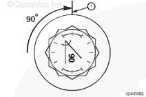 一個缸蓋上的所有螺栓(1 到 6 號)都擰緊到 217 N•m [160 ft-lb] 后,必須將這些螺栓沿擰緊的方向再轉 90 度。將螺栓擰緊至 217 N•m [160 ft-lb] 后,在缸蓋和 12 角螺栓頭上做標記,以便為額外的轉動提供參考點。轉動螺栓,直到缸蓋上的指示標記在第三和第四角頭之間。