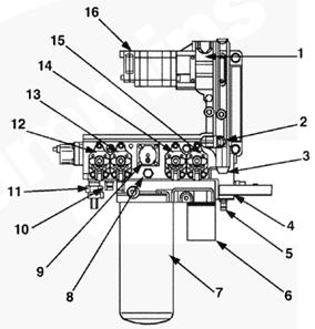 1加注旁通閥(內部),2 320-psi 壓力調節器,3 36-mc 濾清器濾網,4燃油進口管接頭/進口濾清器殼,5快斷壓力鎖片 — 吸入側,6燃油加注泵,7燃油濾清器,8 250-psi 壓力調節器,9燃油切斷閥,10快斷壓力鎖片 — 壓力側,11燃油壓力傳感器,12前油軌執行器,13前正時執行器,14后正時執行器,15后油軌執行器,16燃油泵總成。