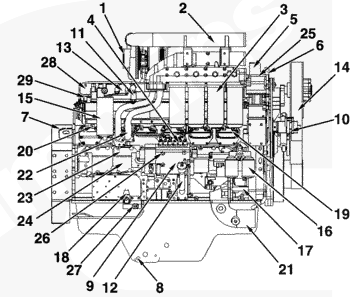 1渦輪增壓器進(jìn)口接頭,2 ATA 跨接接頭,3組合式機(jī)油濾清器,4高壓燃油管,5冷卻液出口接頭,6吊耳,7飛輪殼,8放油口,9右排燃油泵,10風(fēng)扇皮帶惰輪總成,11燃油進(jìn)口管接頭,12加油管,13燃油供應(yīng)泵殼,14風(fēng)扇輪轂,15燃油濾清器,16冷卻液添加劑,17冷卻液泵,18燃油切斷閥 2(右排),19進(jìn)氣歧管壓力傳感器 2(右排),20進(jìn)氣歧管溫度傳感器 2(右排),21冷卻液進(jìn)口接頭,22機(jī)油輸送管,23 Centinel 驅(qū)動(dòng)器接頭,24 Centinel 油箱油位開關(guān)接頭,25充電機(jī),26溢流閥,27燃油出口管接頭,28供油壓力傳感器,29供油溫度傳感器,