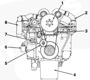 1渦輪增壓器進(jìn)口接頭,2 ATA 跨接接頭,3排氣口接頭,4發(fā)動(dòng)機(jī)轉(zhuǎn)速傳感器,5冷卻液出口接頭,6前吊耳,7飛輪殼,8曲軸箱通風(fēng)裝置,9風(fēng)扇輪轂,10充電機(jī),11冷卻液液位開關(guān)接頭,12組合式機(jī)油濾清器,13燃油進(jìn)口管接頭,14后吊耳。