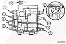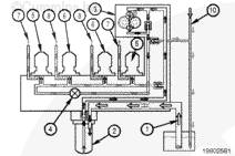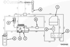 溢流閥 (8) 調節向噴油泵的供油壓力并將多余的燃油輸送回油箱 (1)。燃油從溢流閥(8)中流過,并流過一個 “T”,在這里與從噴油器(9)中未使用的燃油會合在一起。然后燃油將流過燃油連接塊 (3) 并流回到油箱 (1) 中。