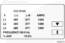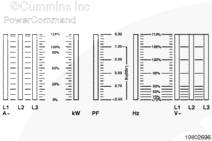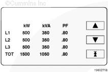 kW、kVA 和 PF 顯示發(fā)電機(jī)組的千瓦(kW)和千伏安(kVA)輸出(平均和單相以及電流方向)和有超前/滯后指示的功率因數(shù)。