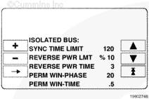 容許窗口時(shí)間 (PERM WIN-TIME):調(diào)整在 PowerCommand® 控制系統(tǒng)發(fā)出斷路器閉合信號前發(fā)電機(jī)組必須與系統(tǒng)母線保持同步的時(shí)間期限(單位:秒)。可調(diào)整的范圍是 0.5 至 5 秒。對于隔離母線的建議值是 0.5 秒。(將控制系統(tǒng)調(diào)整為更小的同步檢查窗口或更長的延時(shí)會(huì)造成同步時(shí)間延長。)
