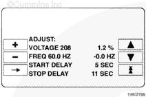設(shè)置和調(diào)整子菜單允許標(biāo)定圖形顯示器上的計(jì)量儀表,并可以調(diào)整系統(tǒng)參數(shù)和用戶定義的故障代碼、發(fā)電機(jī)組的電壓/頻率以及并聯(lián)應(yīng)用類型。設(shè)置和調(diào)整子菜單只能由合格的技術(shù)人員進(jìn)行修改。