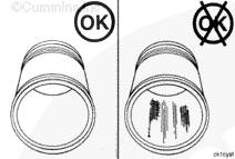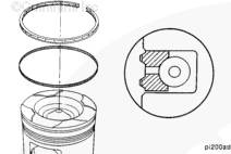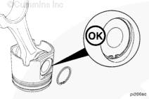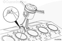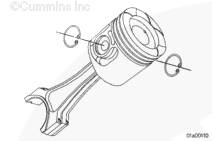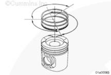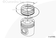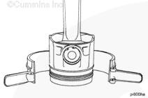 使用活塞環擴張器(零件號 3823871)拆卸活塞環。在活塞環上配一標簽,在標簽上記錄活塞所屬的氣缸號。