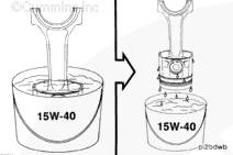 將活塞和活塞環總成浸在一個盛有干凈的 SAE 15W-40 機油的容器中。將活塞和活塞環總成從容器中取出,瀝盡過多的機油。