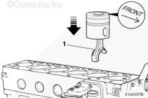 連桿 (1) 的長端必須在發動機的排氣側。如果不是,核實活塞正確安裝在連桿上。