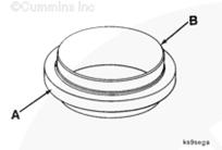 新的曲軸后油封 (A) 將安裝在油封導向工具 (B) 上。在將油封安裝在曲軸前端上時,此油封必須留在油封導向工具上。這可確保在安裝期間不會損壞油封唇部。