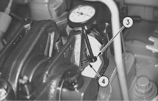 安裝145-5191千分表支架在氣門蓋底端的螺絲孔(2). 調整在氣門過橋( 4 )上端的接觸表面( 3 ).