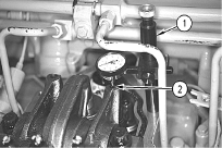 Install the 145-5191 Gauge Support in the rear bolt hole (2). The rear bolt hole is located in the valve cover base. Adjust contact point (3) on the top edge of valve bridge (4) .