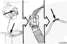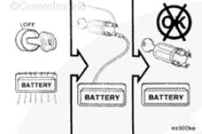 蓄電池可能會有易爆性氣體逸出。為了盡可能避免人身傷害,在維護蓄電池前,必須保持康明斯B3.3和QSB3.3發動機艙通風良好。為避免產生電弧,應首先拆下負極 (-) 蓄電池電纜,并最后連接負極 (-) 蓄電池電纜。