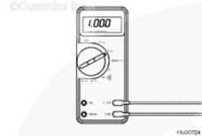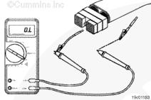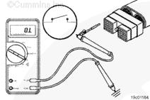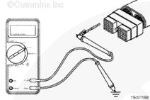 調(diào)整萬用表以便測量電阻。然后將一根測試導(dǎo)線插入 OEM 線束接頭的離合器踏板位置開關(guān)信號(hào)觸針。將另一根測試導(dǎo)線插入康明斯離合器踏板位置開關(guān)回路觸針。將鱷魚夾與萬用表表筆相連。