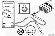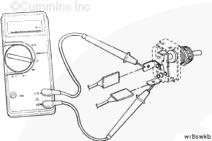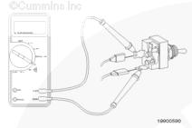 調整萬用表以便測量電阻。將測試導線插入 OEM 線束接頭的巡航控制 ON/OFF 開關輸入觸針,然后將其連接到萬用表表筆上。從鱷魚夾上拆下另一根萬用表表筆,然后將其接觸康明斯ISF3.8 CM2220發動機缸體接地。
