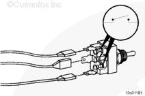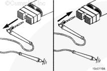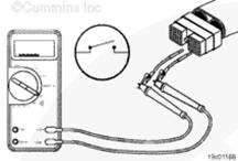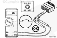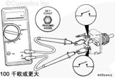 從康明斯巡航控制 ON/OFF 開關輸入觸針上拆下測試導線,然后檢查所有其它觸針。測量電阻。萬用表必須顯示開路(100K 歐姆或更大)。