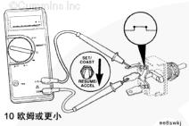 萬用表的一支表筆接觸開關的 RESUME/ACCEL(恢復/加速)端子。另一支表筆接觸底盤接地將該開關撥到 SET/COAST(設置/滑行)位置,然后再到 RESUME/ACCEL(恢復/加速)位置。測量電阻。